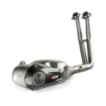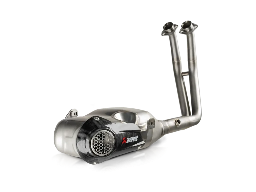 Inspiré du concept présenté à l’EICMA 2024, cet échappement a été conçu pour s’intégrer parfaitement aux lignes de la moto. Fabriqué d’une seule pièce en acier inoxydable de haute qualité et façonné grâce à une technologie de pointe, le convertisseur catalytique est soudé à l’intérieur du silencieux. Il est doté d’un cache en fibre de carbone fabriqué à la main , intégrant la sortie d’échappement avec une protection en nid d’abeille et un logo Akrapovič rouge et blanc.